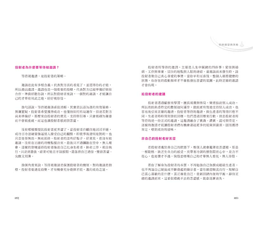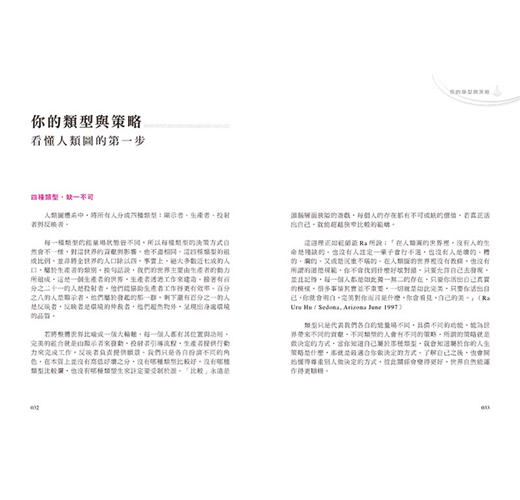從第一章認識能量場開始讀起,你知道每個人都有屬於自己的能量場嗎?能量場是人與人之間相互影響與制約的原因。基於不同的能量場,我們劃分出不同類型。所以第二章談類型,這就是你常常聽到的人類圖術語:顯示者、投射者、生產者(純生產者與顯示生產者)以及反映者,不同類型的人做決定的方式也不同,而做決定的方式就是「策略」。所謂的活出自己,並不是唱高調或某種遙不可及的崇高理想,而是你時時刻刻都保有自覺,為自己做出正確的決定。