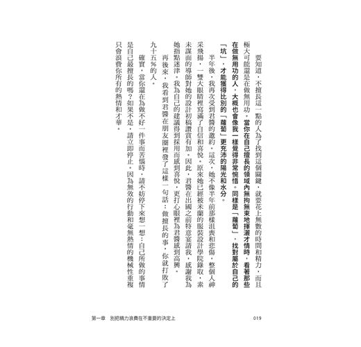 ◎人生中有很多失敗並不是因為自己努力得不夠,而可能只是因為暫時還沒有找到最適合自己走的那條路。