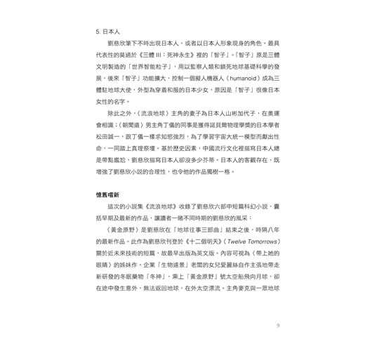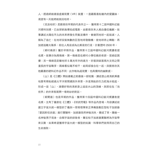 代表作:「三體系列」、《球狀閃電》、《超新星紀元》、《流浪地球》、《朝聞道》、《鄉村教師》等。