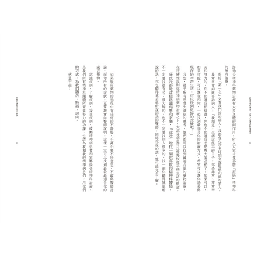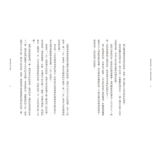 也因為有著這樣的自我期待,楊醫師常常為病人爭取被公平對待的機會。無數的故事更是行醫二十年來積累的片段,透過細心的心靈照護,用醫者仁心為出發點,記錄了相遇在身心科診療室裡的當下,一個個鮮活的生命故事,以及醫病之間「精采」的對話,讀來可能會莞爾一笑,當然也有許多令人心酸和不捨的故事。