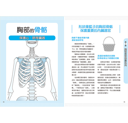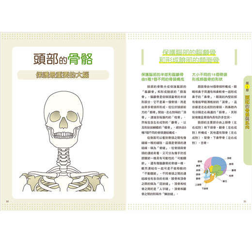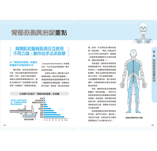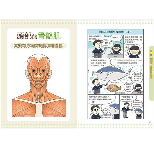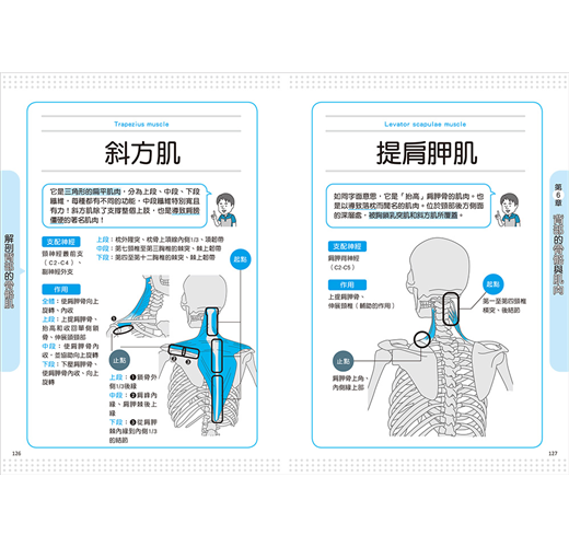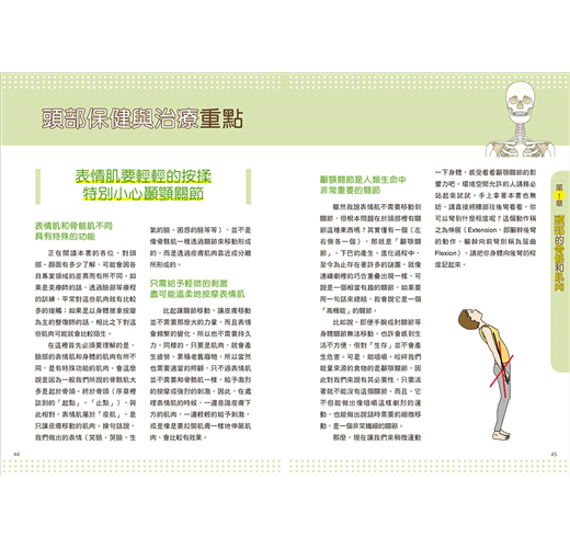 全書依照人體不同部位分章節,介紹頭部、頸部、上肢、胸部、腹部、背部以及下肢,並說明該部位裡骨骼、肌肉、關節、神經的關連性。每翻開一頁就是一張一肌肉圖,可以像閱讀地圖般逐步熟悉複雜的身體運作機制,也能自然而然記住專有名詞,讓人系統化地理解與吸收,有需要時就能立即派上用場。