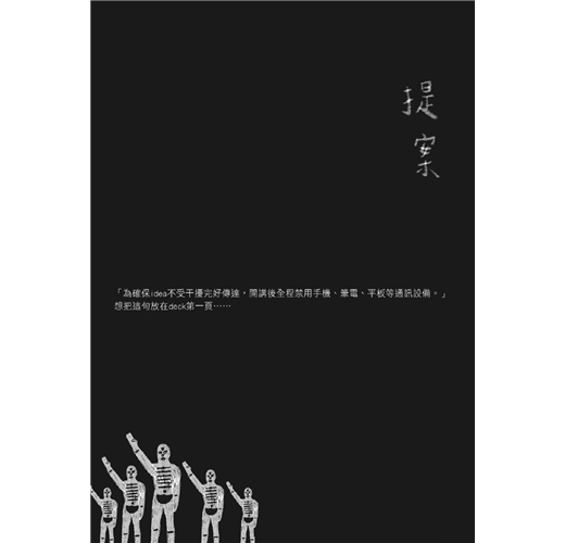 提案 「為確保idea不受干擾完好傳達,開講後全程禁用手機、筆電、平板等通訊設備。」想把這句放在deck第一頁……