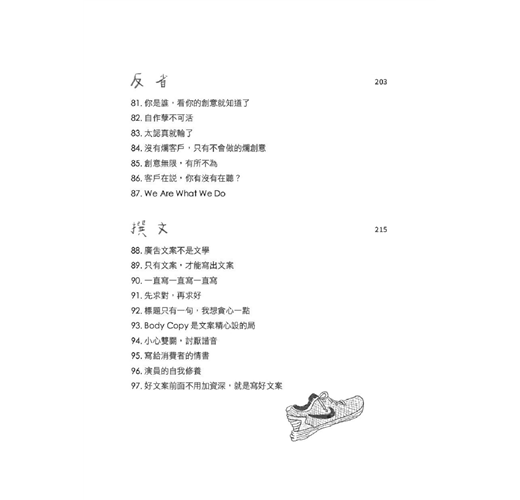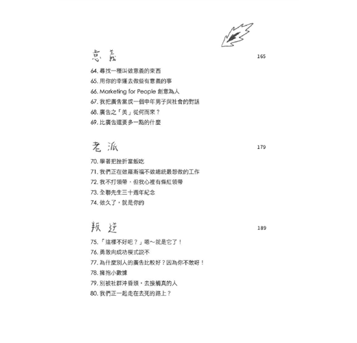 看了這本書,感受到大中對廣告、對創意就是一個字──Passion!大中用類似宗教狂熱分子的態度,熱烈的學習、思考、實踐,並且無私的奉獻。看得我頻頻點頭,充滿了認同與學習。