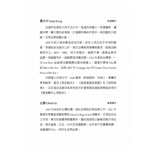 創意或許沒有準則,但這本書可以成為任何創作者一盞暗夜裡的隙光,沿著光,一窺創意人龔大中創作的每一步。二十年的精華,二十年不藏私的故事,第一手熱騰騰的真實呈現。