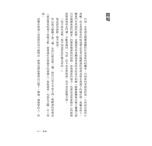 汽油、水果酒及微微發酸的炸魚氣味同時襲來。汽油味的來源是約莫一小時前出海的小漁艇,而水果酒和魚的味道想必是來自喝醉酒的管理員留在我窗下的嘔吐物。我躺在床上,聽著門外黑海的浪聲,意識還有些迷糊地看著阿布哈茲共和國(蘇聯解體後自稱主權獨立卻只有俄國承認的國家)的警察搜索我的房間。而我過夜的地方,也就是這座渡假中心的經理則緊張地站在門邊,不斷重複同一句話,但不是在對我說,也不是在對警方說:
