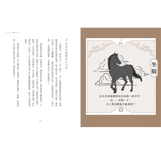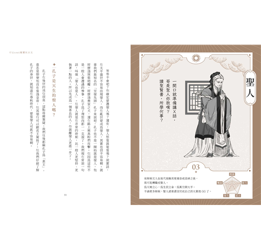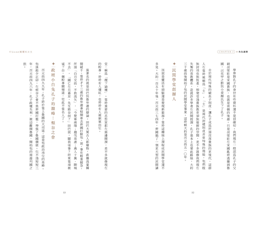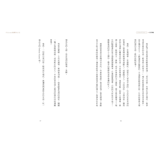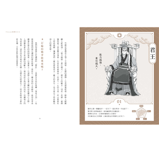 立峰老師以手遊打 Game 的概念,選擇「君王、貴族、聖人、美人⋯⋯」等角色,加值「琵琶、美酒、名馬、名劍⋯⋯」等裝備,使用「毋忘在莒、退避三舍」等戰術,來打一場「赤壁」或是「淝水」之戰,最後解鎖古文經典。用這樣的闖關方式來讀古文,真可謂創意十足,讓古文多了現代感,更能貼近國、高中生想法,保證能對國文、歷史大為改觀唷!