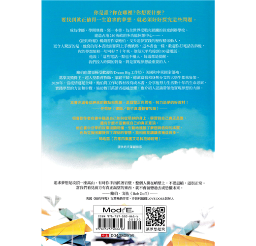 成為律師、學開飛機、寫一本書、為全世界受戰火蹂躪的孩童創辦學校、建造占地240英畝的多功能休憩中心……,《紐約時報》暢銷書作家鮑伯.戈夫追夢實踐的歷程精采動人,更令人驚訝的是,他寫的每本書後面都附上手機號碼,這本書也一樣,歡迎你打電話告訴他,你的夢想旅程一切可好?