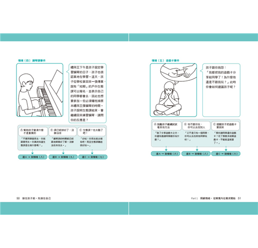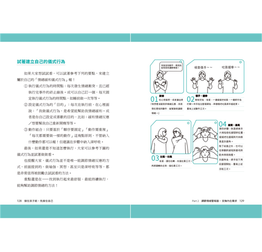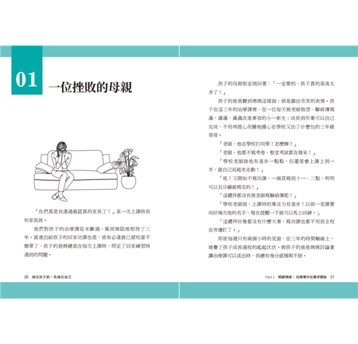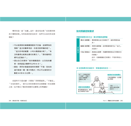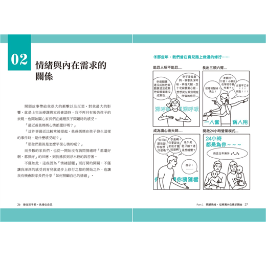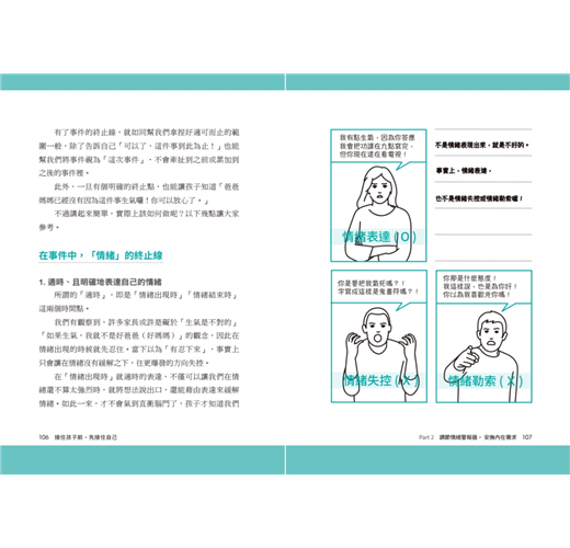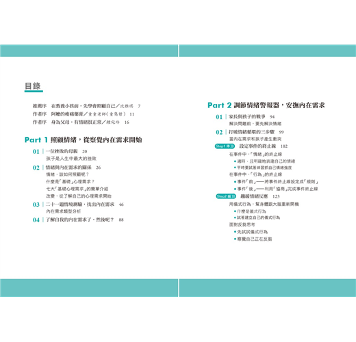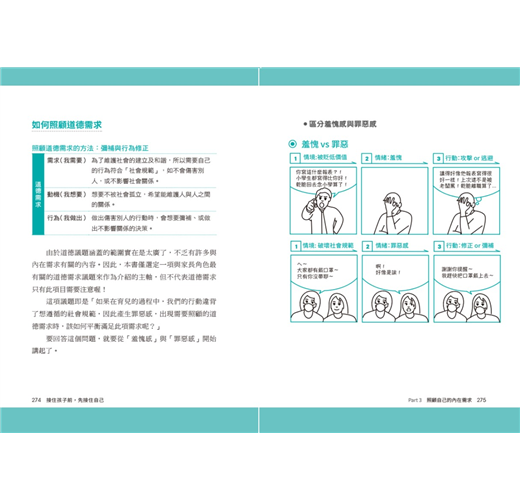 這本書是以父母角色為出發點,經驗式探索身為爸媽,在面對孩子的時候,自己會出現的心理狀態,書中內容借用對話範例來做開場,透過模擬的情境及選項,來幫助了解自我的各個面向,接著練習理性地檢視前因後果,釐清言行不一致或立場相互矛盾的自我內在衝突,還有自我和小孩之間差異或不協調的外在衝突,方能有效地領悟負面感受來源,並安撫自己的不穩定情緒,然後愈來愈懂得感性地照顧自己,為自己也為孩子帶來正性溝通互動的改變。