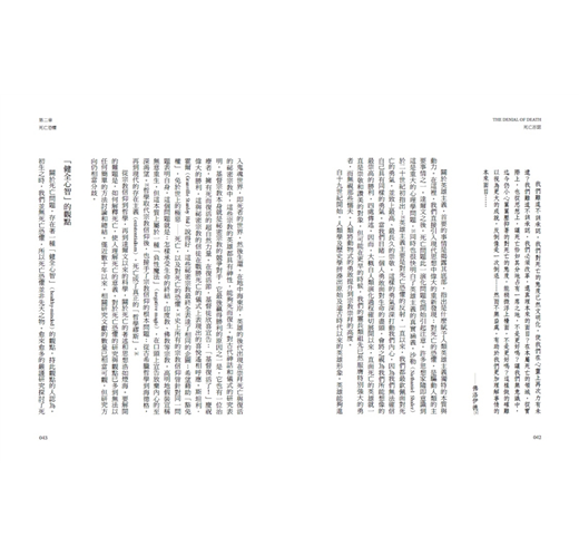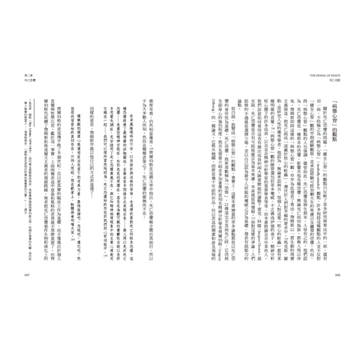 歐內斯特.貝克爾的《死亡否認》原著出版於一九七三年,以精神分析與實在論(realism)為脈絡,迄今仍具時代性的導引。作者立論重點不在於以邏輯成理的方式解構死亡,而是清楚論述特殊英雄主義的作祟,如納粹社會存在著邪惡、毀滅人性的體系,使得人們無法直面自身陰影。人們有時以盔甲保護的防衛機制與自戀式武裝因應,以為可以抵抗死亡,卻依舊徒勞。本書提出了英雄主義的失敗,衍生的精神病與神經症(注:臺灣一般將neurosis通譯為精神官能症,但從Freud的討論來看,神經症一詞更貼近原來的脈絡。本書內文則採用神經質與精神官能症並用的譯法,藉以顯示從神經質到精神官能症的異質心理病理脈絡,透過翻譯上的語境顯示症狀上所涵蓋的程度差異)的類型,重要的不是診斷學的病理驗證,而是打開認識死亡的難題,直抵生命多樣性,接受死亡是自然的一部分。作者認為科學與宗教的非對抗性,或許帶來更多挑戰;但當死亡在各處都受到追捕和壓制,它同時也在各處重新出現。它不再是那種在某些時代困擾著想像的啟示錄民俗,透過本書的脈絡,死亡進入最平庸的現實,它顯出本身,不是退行;死亡是復歸,是象徵生活上的多樣挑戰。