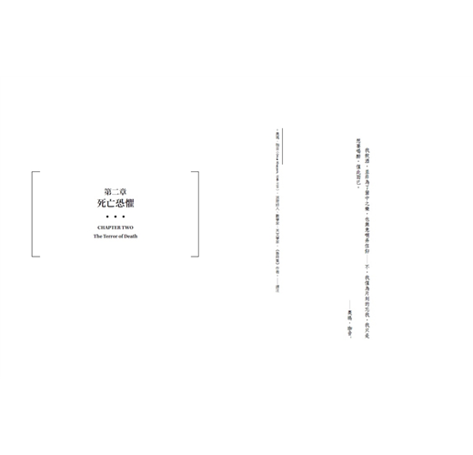 坦白說,我贊成「病態心智」的觀點。事實上,這整本書涵蓋的眾多論點都是以死亡恐懼的普世性為基礎。死亡恐懼,我更喜歡稱為「恐怖」,以傳達完全直面死亡時,它消耗全副身心的強烈程度。我首先想要介紹並多加著墨的是知名精神分析學者齊爾伯格(GregoryZilboorg)一篇論文,它格外精闢,即使是幾十年前的作品,但以表述的簡潔和涉及領域的廣度來看,仍然相當優秀。齊爾伯格在這篇文章中指出,死亡恐懼極少露出真面目,所以不為大多數人所知。然而在種種表象之下,死亡恐懼的確無所不在: