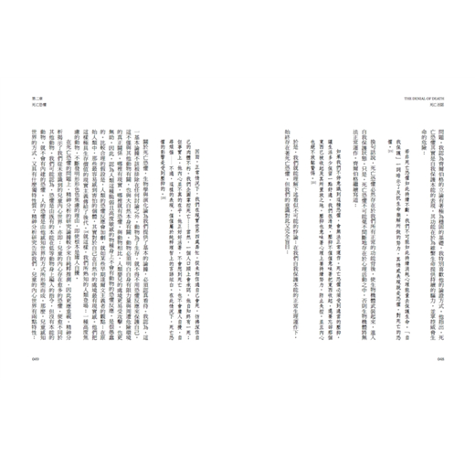 歐內斯特.貝克爾的《死亡否認》原著出版於一九七三年,以精神分析與實在論(realism)為脈絡,迄今仍具時代性的導引。作者立論重點不在於以邏輯成理的方式解構死亡,而是清楚論述特殊英雄主義的作祟,如納粹社會存在著邪惡、毀滅人性的體系,使得人們無法直面自身陰影。人們有時以盔甲保護的防衛機制與自戀式武裝因應,以為可以抵抗死亡,卻依舊徒勞。本書提出了英雄主義的失敗,衍生的精神病與神經症(注:臺灣一般將neurosis譯為精神官能症,但從佛洛伊德的討論來看,神經症一詞更貼近原來的脈絡。本書內文則採用神經質與精神官能症並用的譯法,藉以顯示從神經質到精神官能症的異質心理病理脈絡,透過翻譯上的語境顯示症狀上所涵蓋的程度差異)的類型,重要的不是診斷學的病理驗證,而是打開認識死亡的難題,直抵生命多樣性,接受死亡是自然的一部分。作者認為科學與宗教的非對抗性,或許帶來更多挑戰;但當死亡在各處都受到追捕和壓制,它同時也在各處重新出現。它不再是那種在某些時代困擾著想像的啟示錄民俗,透過本書的脈絡,死亡進入最平庸的現實,它顯出本身,不是退行;死亡是復歸,是象徵生活上的多樣挑戰。