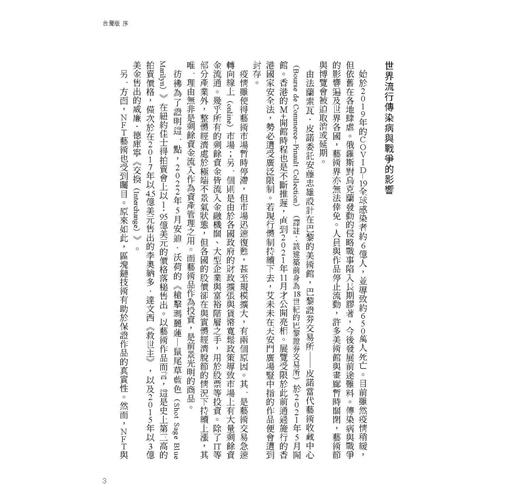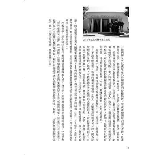 只要世界不改變,藝術界的結構與市場的瘋狂程度將不會有任何改變。因為當代的藝術界與藝術市場,便是你我所生存其中的全球資本主義社會的縮影。在這一層意義上,本書所描繪的藝術結構無論是在疫情大流行前或之後、戰前或戰後,不知是幸或不幸,都仍存在。身為作者,我的心情五味雜陳。