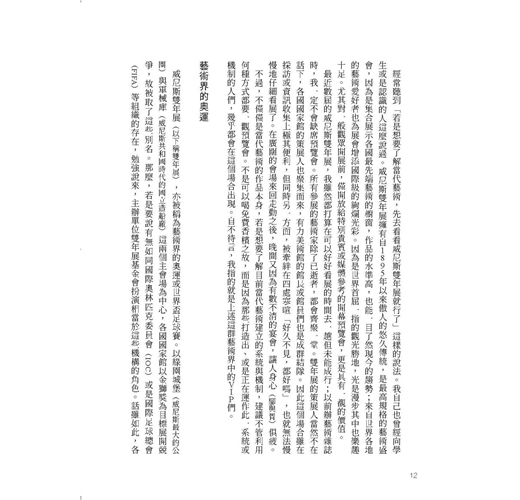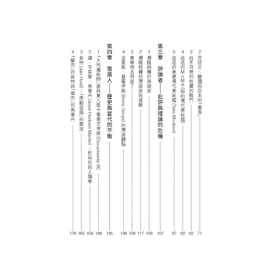 作者從當代藝術特定的事件、機構、人物著手,帶領讀者穿越當代藝術既矛盾又現實的身影。雖不時發出懷疑論的聲音,卻提供讀者不同角色周旋各種場景浮世繪般的敍述。最後,他總不忘將我們帶回過往──尤其是杜象那裡──彷彿有更多的藝術課題,正等待今日的藝術家重新操演與探訪。