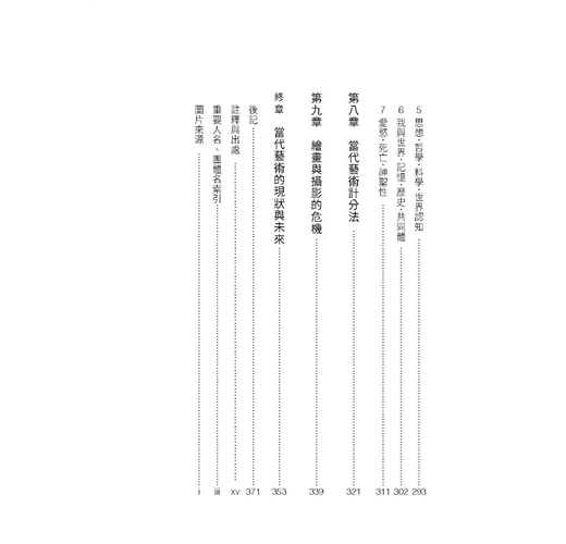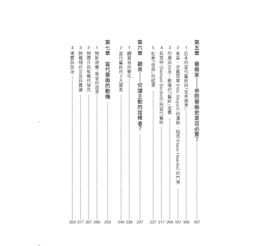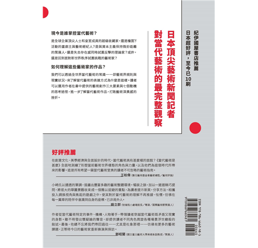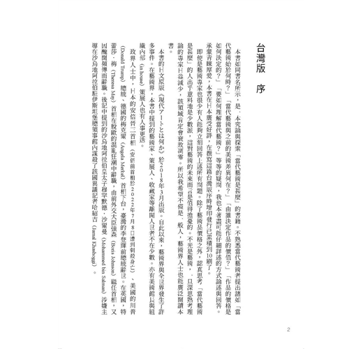 本書如同書名所示,是一本究論與探索「當代藝術是甚麼」的書籍。不熟悉當代藝術者提出諸如「當代藝術始於何時?」「當代藝術與之前的美術差異何在?」「由誰決定作品的價值?」「作品的價格是如何決定的?」「要如何理解當代藝術?」等等的疑問,我也本著盡可能仔細詳述的方式論述與回答。承蒙青睞厚愛,本書在日本廣受好評,在撰寫這篇台灣版序時增印發行已累積到10刷了。