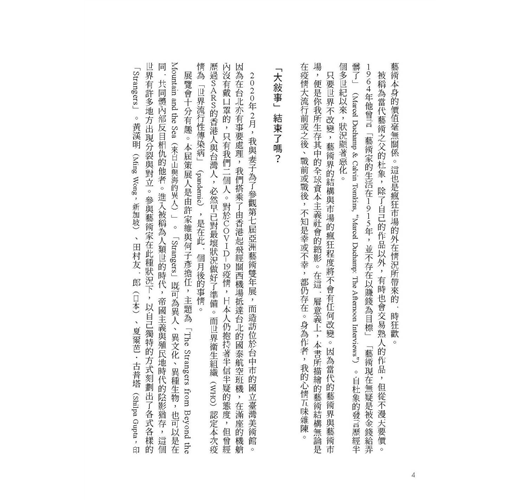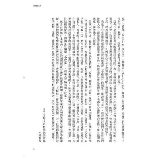包含台灣與日本在內,世界的劇烈變化今後可能還會繼續。藝術家深刻真切的表達呈現亦將不斷湧現。在向他們的思想與作品致敬的同時,我更願意期待「大格局」作品登場的那一天。但願拙作能對此有所貢獻。並且,我要對所有讓本書台灣版得以實現的相關參與者,與所有拿起本書的讀者致上謝意。