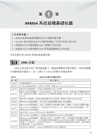 全書共分23章,包含ARMv8/ARMv9系統結構基礎知識以及Cortex-A72處理器。並針對樹莓派4B開發板,用來架設實驗環境。內容涵蓋A64指令集中載入與儲存指令、算術與移位指令、比較與跳躍指令、PC相對位址載入指令、記憶體獨占存取指令、異常處理指示、系統暫存器存取指令、記憶體屏障指令等。