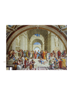 文藝復興時代的天才畫家拉斐爾,受教皇儒略二世之託,為其辦公室的四個房間繪製濕壁畫。在代表智慧的「簽字廳」中,〈雅典學院〉(The School of Athens)跨越幾百年的時間長河,將古希臘哲學家招喚聚集,在此進行美麗且悠閒的世界觀對話,並以當時尚未普及的透視法繪製,完成這幅歌頌西方文明智慧的經典大作。