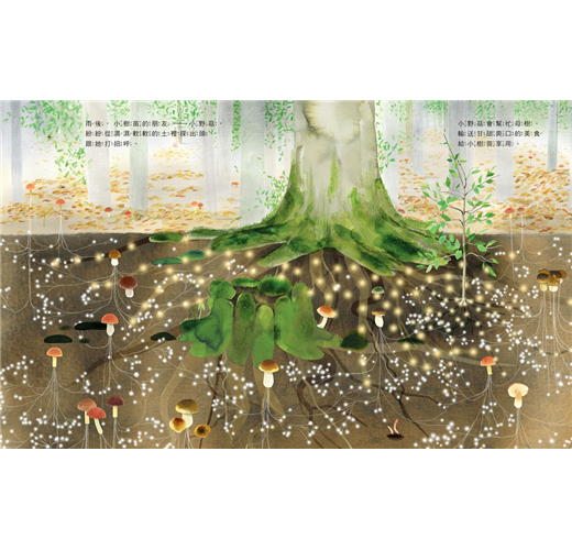 書中有非常豐富、森林生態的環境知識,如:樹家族如何透過真菌網絡互相照顧、分享、對話,母樹的警報保護與世代傳承機制,還有森林四季的景觀變化、各季節出現的代表動植物、樹的成長歷程、地上真菌群的互生關係⋯⋯與森林生態相關的知識,這裡應有盡有!