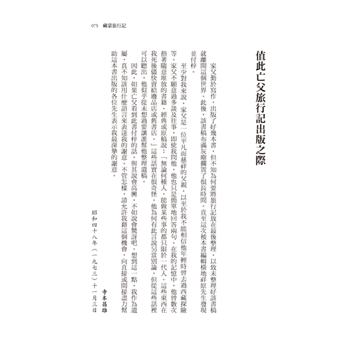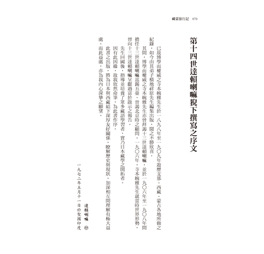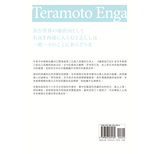 本書為昭和四十八年日文初版的中譯本,書中記載當時西藏的自然狀況、風土人情、神話傳說、政經制度與寺院制度等豐富資料,書前並附三十幅照片,內含關係人士與寺本婉雅往來書信等珍貴史料。