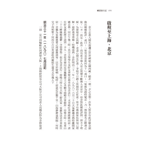 余立志進入聞名遐邇之世界神祕之國西藏,絕非一朝一夕之念想。許多人對余有此冒險念頭做出種種批評,或曰:「渠究竟意欲何為?」或曰:「渠僅為趕時髦耳,乃一博取虛名之輕薄之徒。」不一而足。此外,尚有更不堪入耳之罵聲不斷傳入余耳中。而余對此種批評則一律不予理睬。為實現余之夙願,余盡心制定計畫,爭取早日踏上所期待之征途。所幸有佛祖保佑與知己理解,最終萬事齊備,時機成熟。余於明治三十一年(一八九八)六月三十日天氣漸趨炎熱時離開家鄉京都。同日午後三時,真宗大學學生及好友齊聚京都車站為余送行。火車噴吐黑煙隆隆向前,諸位好友就此揮手道別。不久,余從車窗向近旁巍峨聳立之本願寺兩殿合掌膜拜。待舉首時,見東山三十六峰綠樹蓊鬱,含情帶愁,似在為余送行。傍晚六時入住大阪上野氏家。家嚴為送余亦來此住宿。余竊為家嚴慈愛之深感激涕零,以至於哽咽。嗚呼!前途茫茫數千里,山海渺渺遠相隔,何時父子再相聚?何況自古以來遠赴西藏能生還者又有幾人?