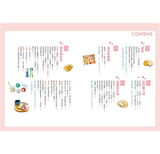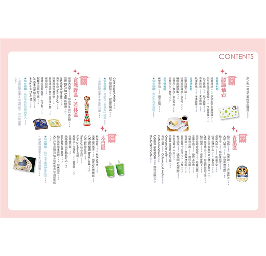 序/來一場森之都的深度慢遊 Part 01 認識仙台 ◆行程便利貼 ・經典路線・伊達政宗主題路線・羽生結弦主題路線・文青路線・女子路線・親子路線・春季路線・夏季路線・秋季路線・冬季路線 ◆交通便利貼 ・空中交通介紹・仙台國際機場~仙台市・機場交通接駁・仙台市~縣內~東北各地・仙台市內~縣內 ◆旅行便利貼 ・保管寄物・觀光諮詢 ★仙台聊聊/靠左靠右都沒錯 Part 02 青葉區 仙台城跡・瑞鳳殿・青葉神社・大崎八幡宮・仙台市博物館・輪王寺・仙台東照宮・櫻岡大神宮・晚翠草堂・仙台媒體中心・五色沼・住友生命仙台中央大樓(SS30)・AER展望陽台・定義如來西方寺・仙台朝市・壹貳參横丁・商店街綜合介紹・經峰公園・定禪寺通・愛宕上杉通・勾當台公園・錦町公園・西公園・台原森林公園・仙台國際中心站・大橋・作並溫泉・鷹泉閣岩松旅館・阿部蒲鉾店本店・Nikka Whisky仙台工場・Crepuscule café・青山文庫・Cafe mozart Metro・Cafe Tamazawa・Ganesh Tea Room・源吾茶屋・Route 227s' Café・Cafe Mozart Atelier・村上屋餅店・定義豆腐店 ★仙台聊聊/就約在「老地方」碰面 |必遊路線提案・青葉區地圖| Part 03宮城野區、若林區 榴岡天滿宮・仙台海洋森林水族館・三井OUTLET PARK 仙台港・Aquaignis Sendai・樂天生命Park Miyagi・陸奥國分寺藥師堂・震災遺址仙台市立荒濱小學・榴岡公園・鐘崎竹葉魚板館‧七夕館・麒麟啤酒仙台工場・JR水果公園仙台荒濱・Antique & Cafe TiTi ★仙台聊聊/仙台市民都認識的男人 |必遊路線提案・宮城野區&若林區地圖| Part 04 太白區 秋保神社・秋保大瀑布・瀧本山西光寺・地底之森博物館・八木山遊樂園Beny Land・八木山動物公園・The Mall仙台長町・LaLa garden長町・鳳鳴四十八瀧・磊磊峽・三神峰公園・漁亭濱屋明日都長町店・Doudan-no-sato・仙台萬花筒美術館・秋保溫泉・大江戶溫泉物語仙台秋保溫泉岩沼屋旅館 ★仙台聊聊/仙台地下鐵與伊達政宗 |必遊路線提案・太白區地圖| Part 05 泉區 二柱神社・七北田公園・仙台冰場・仙台泉 Premium Outlets・仙台天道白衣大觀音/大觀密寺・SPRING VALLEY泉高原 ★仙台聊聊/屬於大人的仙台裏滋味 |必遊路線提案・泉區地圖| Part 06 仙台看熱鬧 青葉祭・仙台七夕祭・Sendai光之樂章 ★仙台聊聊/「七夕」當然在八月 Part 07 品吟職人技 松川達摩・玉蟲塗・仙台平・仙台露香・堤人形・小芥子・仙台弁小芥子・小芥子島貫本店 ★仙台聊聊/各有所好的竹葉魚板 Part 08 品嚐仙台味 仙台牛舌・竹葉魚板・仙台青葉餃子・仙台牛・中華冷麵・仙台水芹鍋・黑糖饅頭・萩之月・霜柱・毛豆泥麻糬・白松最中・支倉燒・仙台Makoron・喜久福大福・仙台限定可樂・Kichi鯛魚燒・仙台土產處仙台・土產通·伊達的小町 ★仙台聊聊/珍奇百景的仙台三奇觀 Part 09 到宮城走走 |松島町|松島灣・瑞巖寺・圓通院・五大堂・福浦島‧福浦橋・雄島・松島遊覽船・松島離宮・西行折回之松公園・馬之背‧子馬・le Roman・觀瀾亭・松島蒲鉾本舗・松華堂菓子店・松島牡蠣小屋 |鹽竈市|鹽竈神社・志波彥神社・浦霞酒gallery・Harema・壽司哲 |大崎市|鳴子峽 |大鄉町|羽生天神社 |柴田町|白石川堤・柴田町船岡城址公園 |川崎町|國營陸奧森林湖畔公園 |白石市|白石城・藏王狐狸村・材木岩・碧玉溪・彌治郎小芥子村・Yamabukitei |七宿町|滑津大瀑布・山彥大吊橋・長老湖・吉野屋 |藏王町|宮城藏王滑雪場澄川冰雪公園・藏王Echo Line・御釜・藏王手打蕎麥新樂 |石卷市|日和山公園・鹿島御兒神社・石之森萬畫館・舊石卷日本正教會教會堂・田代島・東京屋食堂 |名取市|永旺夢樂城名取 ★仙台聊聊/沒有定禪寺的定禪寺通 |宮城縣地圖|