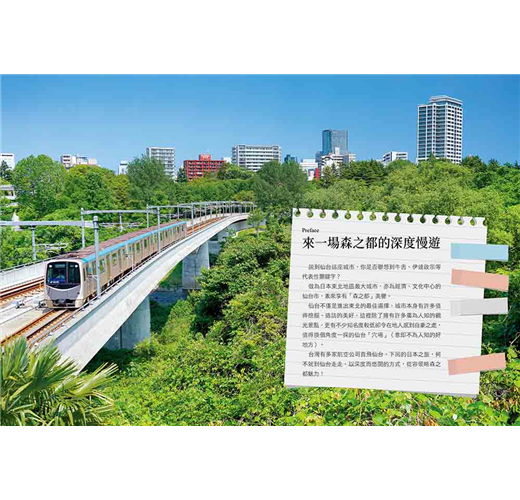 序/來一場森之都的深度慢遊 Part 01 認識仙台 ◆行程便利貼 ・經典路線・伊達政宗主題路線・羽生結弦主題路線・文青路線・女子路線・親子路線・春季路線・夏季路線・秋季路線・冬季路線 ◆交通便利貼 ・空中交通介紹・仙台國際機場~仙台市・機場交通接駁・仙台市~縣內~東北各地・仙台市內~縣內 ◆旅行便利貼 ・保管寄物・觀光諮詢 ★仙台聊聊/靠左靠右都沒錯 Part 02 青葉區 仙台城跡・瑞鳳殿・青葉神社・大崎八幡宮・仙台市博物館・輪王寺・仙台東照宮・櫻岡大神宮・晚翠草堂・仙台媒體中心・五色沼・住友生命仙台中央大樓(SS30)・AER展望陽台・定義...