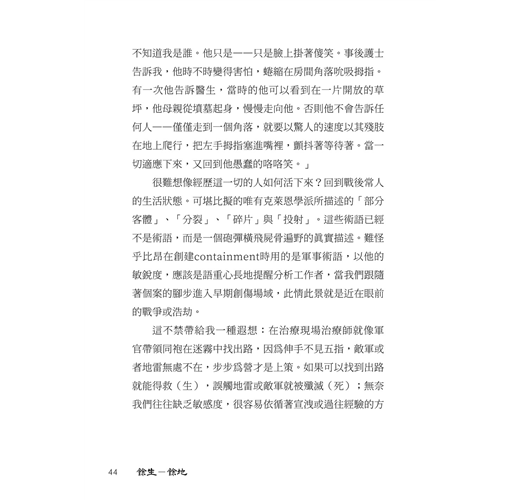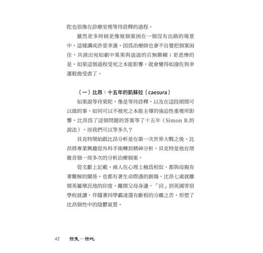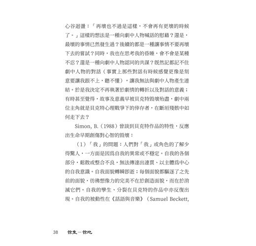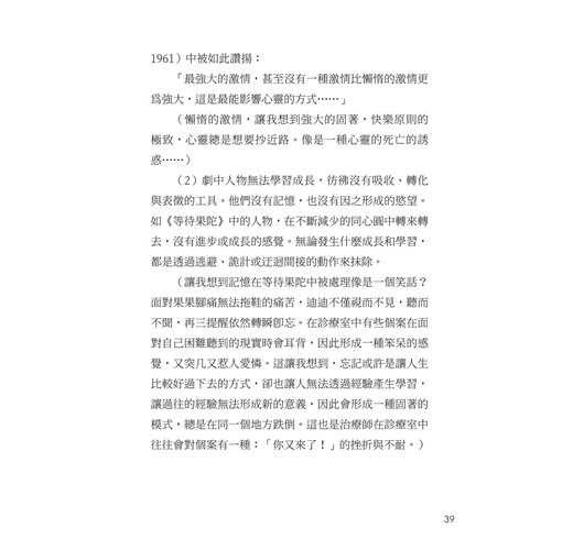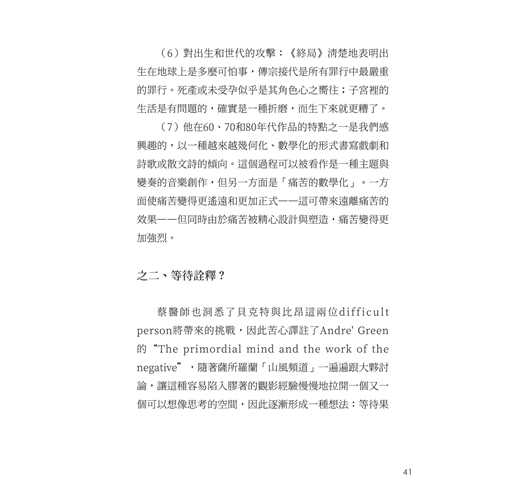 ◎讓我們一起探求貝克特和比昂對人類原始心智、潛意識溝通、存在意義和本質的看法,他們的作品在在解構了我們習以為常的建構,但卻化作浩瀚的大海,充滿謎和解答。