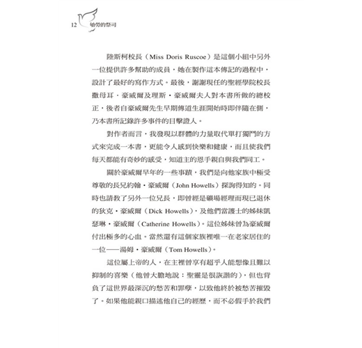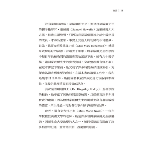 我有幸撰寫理斯‧豪威爾的生平,都是拜豪威爾先生的獨子撒母耳‧豪威爾(Samuel Howells)及豪威爾太太之賜。但我必須聲明,只因為我是這個撰述小組中最年長的成員,才忝為主筆,事實上其他人的功勞均不可磨滅。首先,我要介紹韓德森小姐(Miss Mary Henderson),她是豪威爾最好的祕書,在過去十年中,將豪威爾先生在學院中每日早晨和晚間的講道忠實地記錄下來。她有八十冊手稿,連同豪威爾先生的參考資料,全部整理得有條不紊;在這本傳記下筆前,她又花了許多時間做好目錄索引,方便我迅速查到重要的資料。在這本書的籌備工作中,我和她幾乎日日共事,她能協助我在許多記述方面保持準確性,並提供我極重要而珍貴的訊息。
