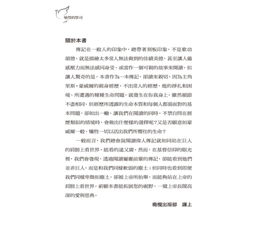 本書讀來親切,因為主角里斯‧豪威爾的親身經歷,不出常人的經歷,他的掙扎和困境、所遭遇的種種生命問題,就發生在你我身上。雖然細節不盡相同、但經歷所透露的生命本質和每個人都需面對的基本問題,卻如出一轍。讓我們在閱讀的同時,不禁自問在經歷類似的情境時,會做出什麼樣的選擇呢?又是否願意如豪威爾一般、犧牲一切以活出我們所嚮往的生命?