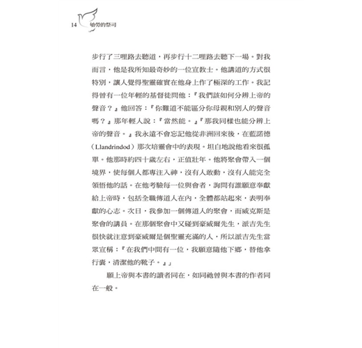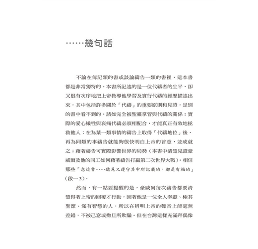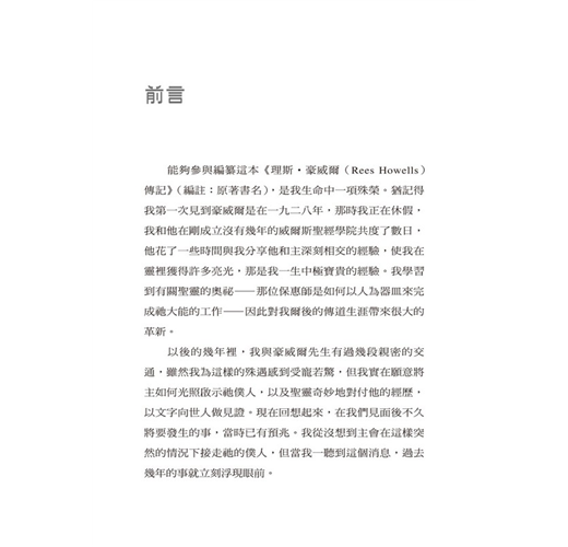 能夠參與編纂這本《理斯‧豪威爾(Rees Howells)傳記》(編註:原著書名),是我生命中一項殊榮。猶記得我第一次見到豪威爾是在一九二八年,那時我正在休假,我和他在剛成立沒有幾年的威爾斯聖經學院共度了數日,他花了一些時間與我分享他和主深刻相交的經驗,使我在靈裡獲得許多亮光,那是我一生中極寶貴的經驗。我學習到有關聖靈的奧祕—那位保惠師是如何以人為器皿來完成祂大能的工作—因此對我爾後的傳道生涯帶來很大的革新。