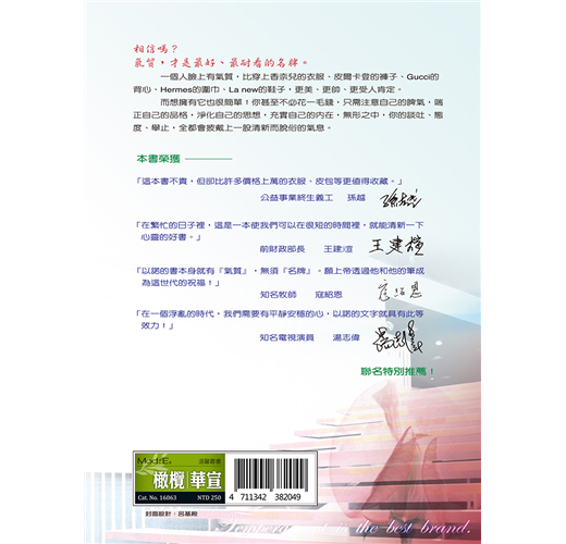 說真的,這本書不貴,但卻比許多價格上萬的衣服、皮包等更值得收藏。期待作者將來在治療病人之餘,還能夠繼續創造出像《氣質,最好的名牌》這樣的作品來影響這個世代。