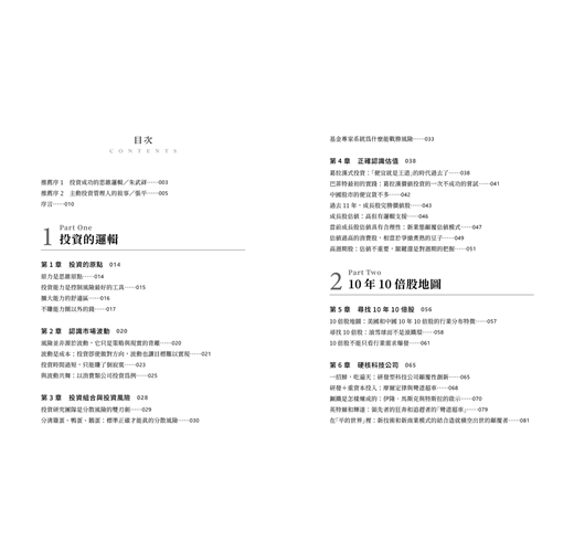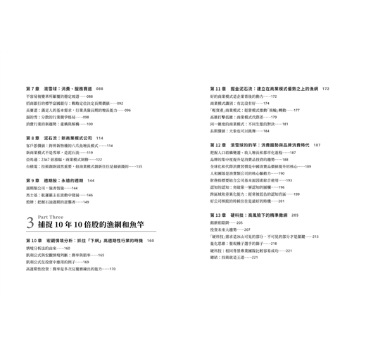 ★「10年10倍」是投資者希望能高機率實現的績效,這需要投資者在資產配置和企業選擇方面具有清晰且系統的思維邏輯。作者基於其20多年豐富且成功的投資實踐,提出了在週期性、消費品和硬科技3個行業中進行資產配置和企業選擇的思維邏輯方法。本書關於投資思維邏輯的闡述通俗易懂,有助於引發投資者的深度思考,值得投資者借鑒。──朱武祥(清華大學經濟管理學院金融系教授/清華經管商業模式創新研究中心主任)