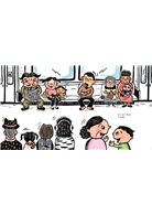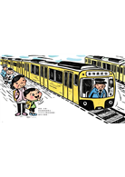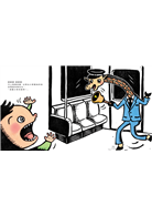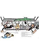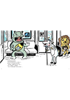 小男孩的聯想其實也幽了不守規矩的乘客一默。兩位作者結合動物的習性或是身形,詼諧地點出搭乘電車時那些不合宜的行為。坐姿太過豪邁的、拉著吊環擺來盪去的、有位置卻遲遲不坐好的、配件太過張揚的...這些干擾他人的言行舉止,對照其他無奈或是不滿的乘客,不只生動描繪了車廂裡的眾生相,也高明又毫無說教意味地帶出應有的禮儀。小男孩的這場「變身」想像,段數很高呢!
