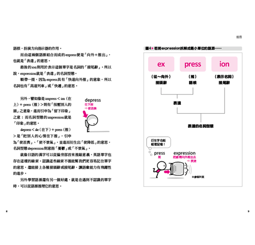 例如,第9頁圖4的expression這個字,就可以拆解成<ex+press+ion>三個語源。