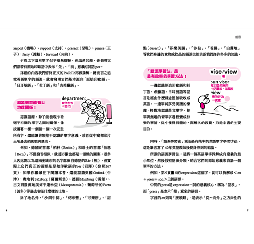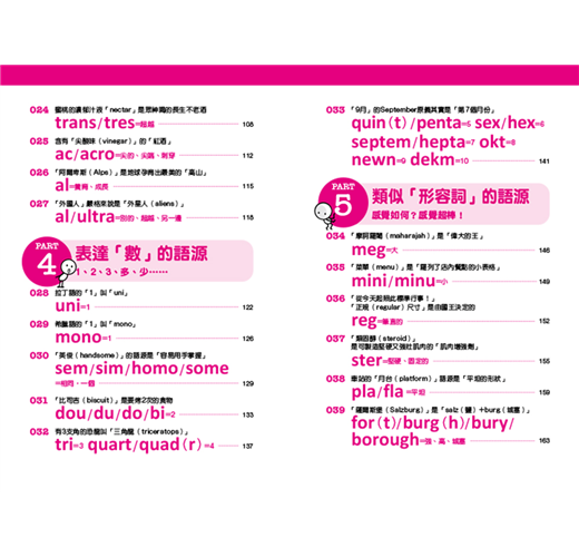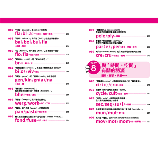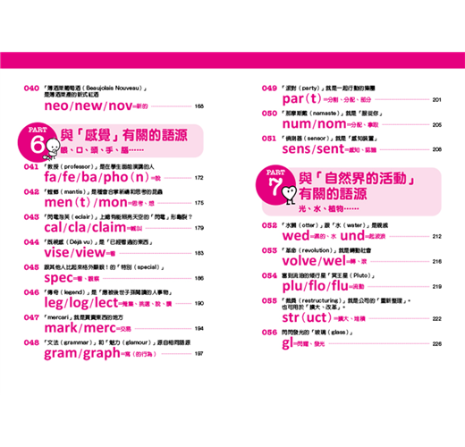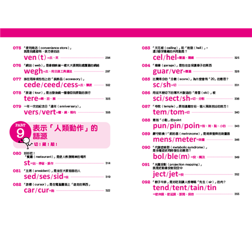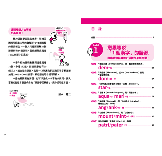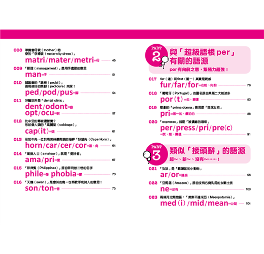 本書介壽的語根數量則遠遠超過14個,多達150,而接頭辭也有30個以上。組合這些語源,就能一口氣讓我們認識的單字數量增加到25000~3000個字,跟母語使用者相同等級。