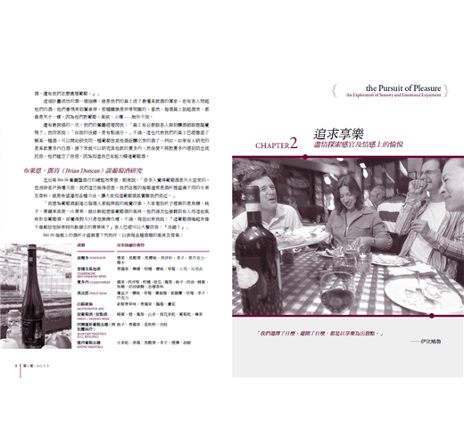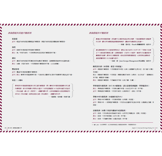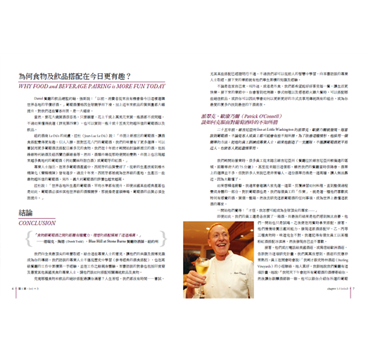 本書訪問了美國數十位最有才華、經驗老到的侍酒師。雖然大家對酒食搭配的幾個要素都有共識,但每位侍酒師對於搭配方式又各有其獨到之處。例如說: