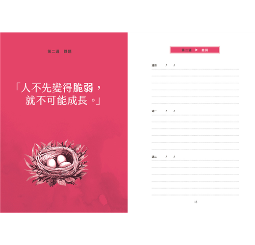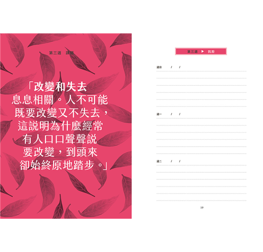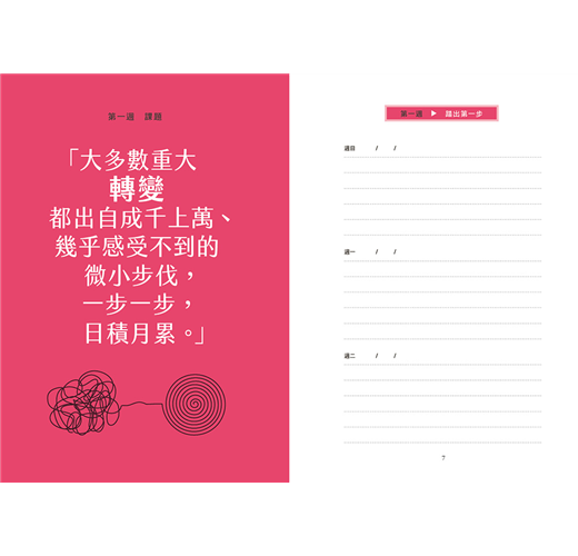 「大多數重大轉變都出自成千上萬、幾乎感受不到的微小步伐,一步一步,日積月累。」正如與心理師兩次晤談之間的間隔,這本日誌在架構上仿每週晤談,每個星期為一個單元,每個單元提出一個課題,鼓勵你像接受諮商一樣,以新的方式思索自身相關經驗、自己怎麼看待這件事等等。一個單元七天,讓你反思自己對這個課題最初的反應,進而深化、擴大你的回應方式,同時見證自身想法的轉變,加以消化並在生活中驗證。希望一年下來,能引領你思考五十二個人生重要課題,開啟有意義的成長與反思的可能。