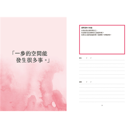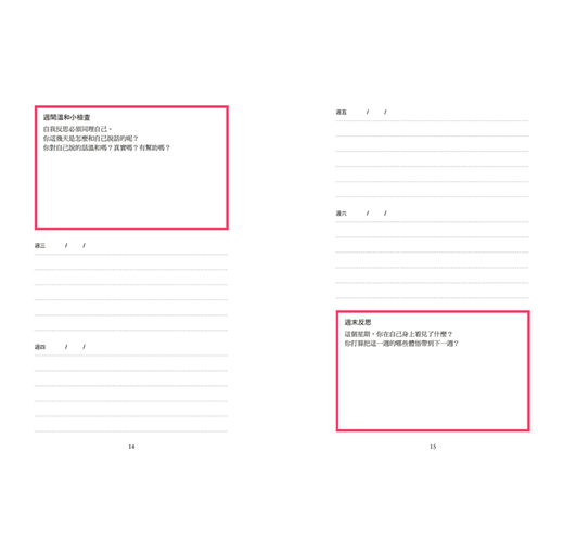 抱持著這種想法,我讓這本日誌既有發揮創意的部分,也有依循架構的部分。因為,雖然擁有個人空間的美好之處就是可以心無旁騖,只顧好自己,但我們有時還是需要額外的幫助(所以我偶爾會追加一兩個課題推你一把),也需要被提醒溫和對待自己。我在《也許你該找人聊聊》裡提過:在人生裡,我們最常對話的對象其實不是你以為的那些人(如伴侶、死黨、兄弟姊妹、父母),而是我們自己。但我們對自己說的話未必溫和、真實、有幫助。我們未必意識得到自己對自己說話的聲音,但那個聲音其實一直很大。所以每週週間有個溫和小檢查,請你確認自己在思索當週課題的時候,對自己的態度是支持的,而非評判的。這個練習會請你問問自己:我對自己說的話溫和嗎?真實嗎?有幫助嗎?溫和小檢查時請放慢速度,專心同理自己,因為這是改變所不可或缺的要素。