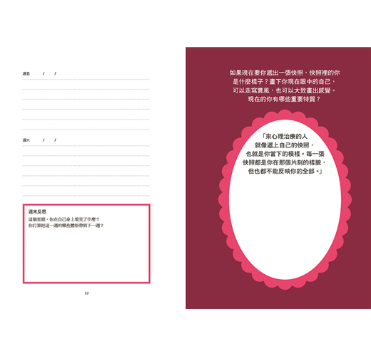 這本日誌反映的是我的諮商工作——陪伴你與自己對話。在架構上,它和每週諮商的節奏相符:每週都以一個課題開始,鼓勵你像接受諮商一樣,以新的方式思索自己的相關經驗、敘事、人際關係。接下來六天就像兩次諮商之間的空檔,讓你反思自己對這個課題一開始的反應,進而深化、擴大你的回應方式,同時見證自身想法的轉變。我一直很欣賞心理治療的這個面向:晤談結束後先花幾天消化談的東西,沉浸在自己的想法裡,設法擺脫無效的舊模式,並在現實生活中嘗試新的方式。下週回到諮商室時回顧自己的進步,在對話中更進一步,逐漸增加覺察,讓情緒重獲自由。