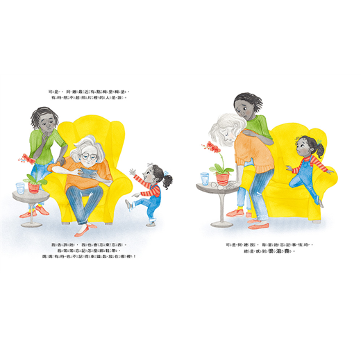 在孩子認識這項疾病以前,面對親愛的阿公、阿嬤突如其來的轉變,可能因此感到困惑、也會產生害怕的心情。這本書從小女孩的角度,道出孩子在面對最親近的長輩罹患失智症時內心的害怕與擔憂,不避談病情發展,而是以淺顯易懂的方式讓孩子知道,阿公、阿嬤那些在我們看來奇怪、不合時宜、記性變差、只是簡單的小事卻無法獨自完成的行為……是因為受到失智症的影響,然而,儘管這些病症讓他們變得有些不同,但他們永遠是我們最親愛的家人,我們充滿愛與耐心的陪伴,就是支持他們面對病情變化的最大力量!