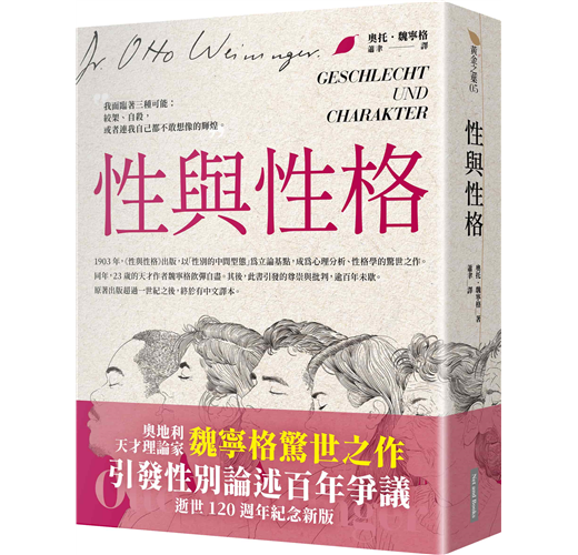 《性與性格》是奧地利哲學家魏寧格成名作,也是其生前發表的唯一著作。該書於1903年出版後,魏寧格自道:「我面臨著三種可能:絞架、自殺,或者連我自己都不敢想像的輝煌。」同年,二十三歲的魏寧格於維也納舉槍自盡。奇葩之死,使這本書終於揭起空前轟動,被譯為多種語言,暢銷全歐。連佛洛伊德後來也必須承認,魏寧格確實「頗具天才」。