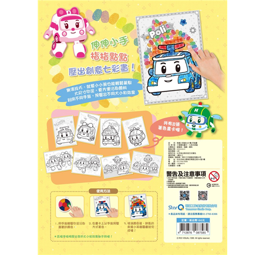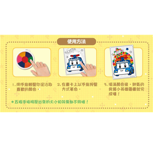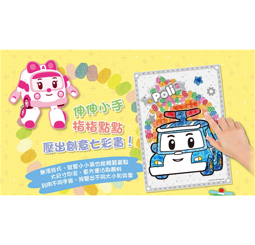 救援小英雄指指點點手指畫BABY篇提供8張著色圖卡和7彩印泥,讓風靡世界的救援小英雄波力陪孩子體驗神奇的指尖魔法,