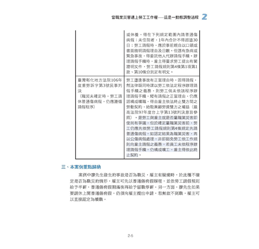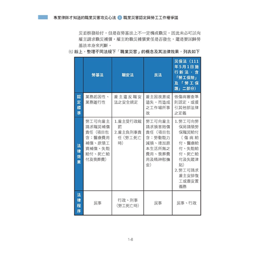 ‧第一冊:職災在法律上如何認定,以及法律對於職災勞工工作權的保障內容。