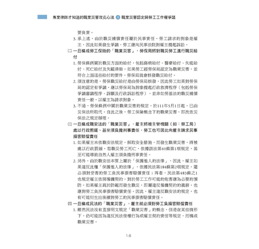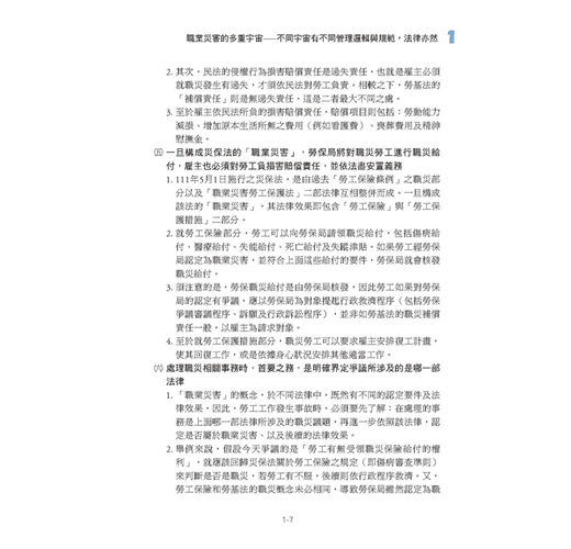 ‧第三冊:雇主應負擔的其他職災相關責任,例如:損害賠償責任、行政責任、刑事責任等,並且對111年5月1日新施行的勞工職業災害保險及保護法,也作一介紹。