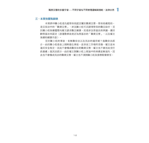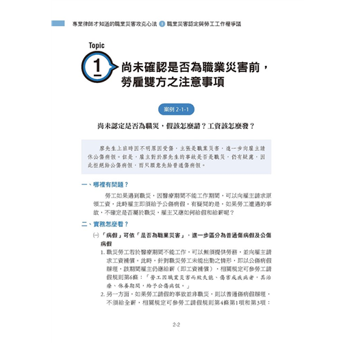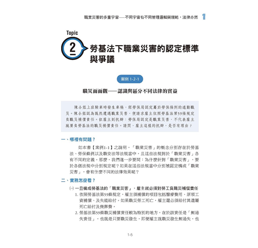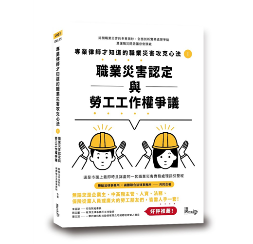 為了處理上述困境,本叢書將職災爭議分門別類,並於各類的爭議下,羅列實務上常會遇到的職災問題,再以問與答之方式,整理了對應的法規以及實務見解。本叢書共計三冊: