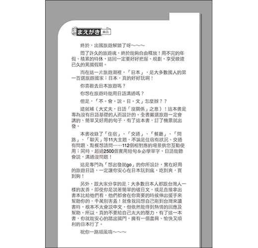 另外,跟大家分享的是:大多數日本人都跟台灣人一樣的友善,即使你是說著簡單的破日文,或是直接拿出書本比給他們看,他們都會在你需要的時候伸出援手來幫助你的,千萬別害羞!就像我回想自己剛到台灣來讀書時,根本不太會說中文,但依然能得到熱情的回應及幫助。所以,真的不要給自己太大的壓力,有了這一本書,你就能安心的踏出國門,擁有一個盡興、愉快又順利的日本行了。