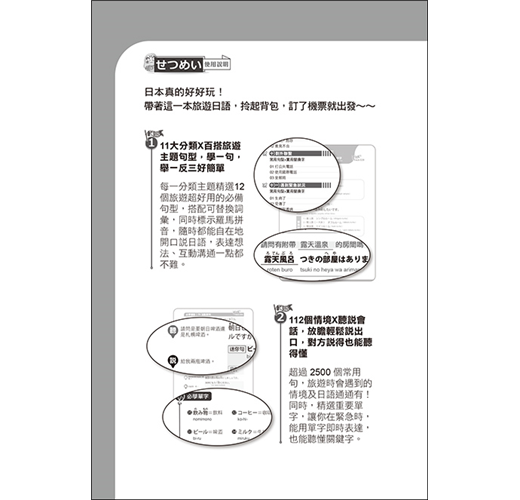 本書收錄了「住宿」、「交通」、「餐廳」、「問路」、「聊天」等11大主題,不論是住宿有狀況、交通有問題、點餐想請問……112個相對應的場景供您互動使用;同時,超過2500個實用短句&必學單字,日語能聽會說,溝通沒問題!