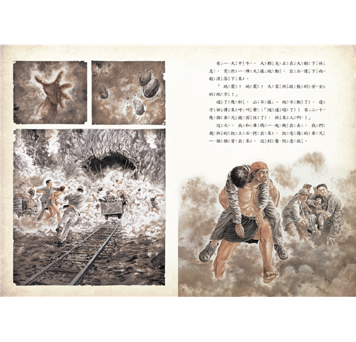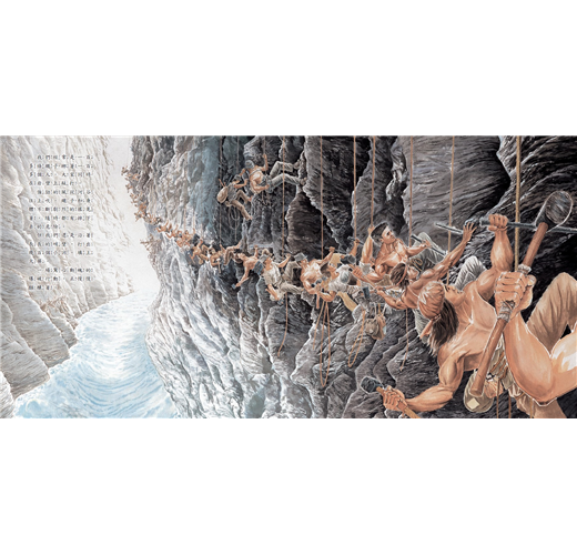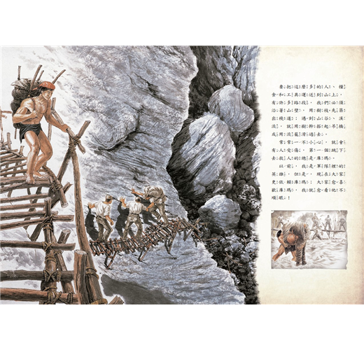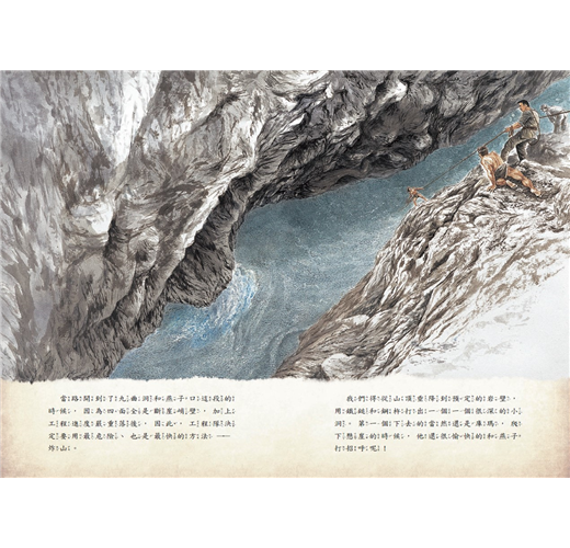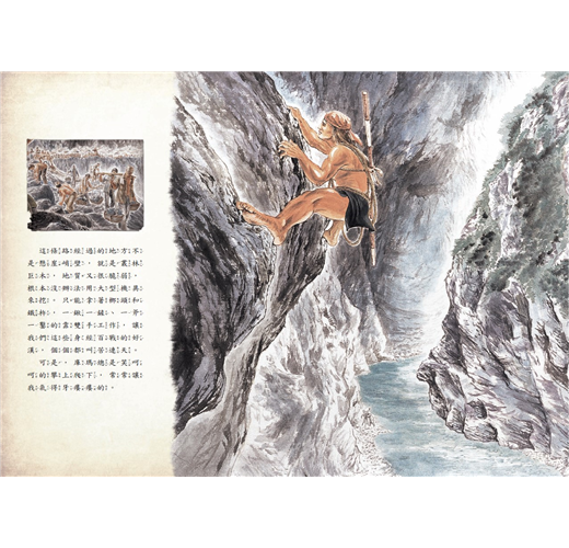 ▍史詩般的繪本鉅作,以水墨的細膩筆觸描繪太魯閣鬼斧神工的壯麗景觀,用大幅拉頁重現百人身繫麻繩、垂掛山壁工作的場景,氣勢磅礡、震撼人心!