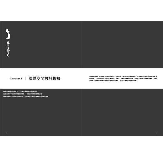 《i 室設圈│漂亮家居》以「聚焦全球空間大賽金獎」試刊,Chapter 1「國際空間設計趨勢」由全球規模最大、最具影響力的設計競賽之一「iF 設計獎」(iF DESIGN AWARD)、以及全球華人市場頂尖設計獎項「金點設計獎」(Golden Pin Design Award)主辦方,以專業賽事舉辦者立場,從設計力量對社會影響觀察角度,分析設計趨勢,同時邀請擔任多項國際設計獎項評審的專業人士,分享寶貴評選經驗與觀察。