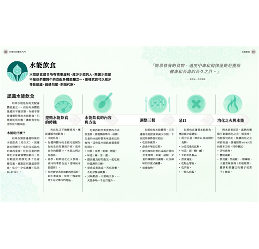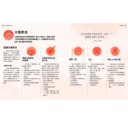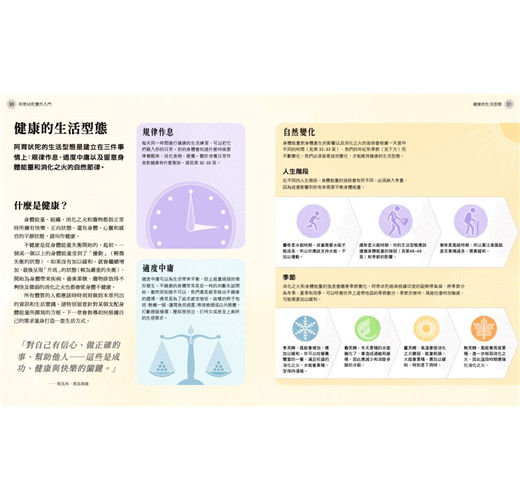 分門別類找出【風能、水能、火能三大體素】運用「飲食」、「瑜伽」、「正念與冥想」、「五業排毒」量身打造的身心健康之旅。